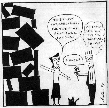psychotic, grim place, but funnier than heck. His take on relationships (about 1/3 of the cartoons) in "What Were You in a Previous Life" is one of impending doom and unrequited obsession. In other words, pretty true to life. (I'm kidding. Sort of.) I think this cartoon sums up the start of a lot of romances pretty nicely: |