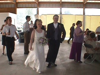 This is the story of one of the best days of my life. June 30, 2001, Mo and I got married... Murphy and his Law had their say, but didn't take the day: A serious fire in the apartment across from the one where the dress was, rings secure in a safety deposit box-- and a lost key, two soon-to-be-newlyweds developing colds, 90 degree heat (plus) that you could swim in, followed by one of the biggest thunderstorms I've ever been out in to finish up the night. Like Mo said, (as a different fire alarm chased us out of the hotel we were at, hours before the ceremony,) "the one-thing-after-another thing can stop now!" But it worked out so well, Mo had done the lion's share of the planning, (and still wanted to marry me despite me being such a bum) and the result was fantastic. The site was great, a beautiful setting. The photographer-- working in an almost rather documentary style, with the "formals" almost an afterthought-- really knew what she was doing. DJ Brother Cleve spun great tunes, balancing the music we requested (by burning a cd for him) against the music people really got into... and finding where those two groups of music overlapped. We had a hayride, a trip to a petting zoo, and it turns out a raging storm can be great to dance in. The food was great, the cake so tasty, the flower arrangements so lovely. And then of course, (well, before all of that) I got married to the terrific person I've been in love with so long... our ceremony was short and sweet. One of the readings was my own Yee and Lan, which is a 'just so' story I wrote once upon a time that seemed custom made for the day. (Though it wasn't...) And we remembered the vows without a burble. Man, I'm very happy. Anyway, I could write more, but I'm out of time, it's past midnight and I have to get to Mexico!