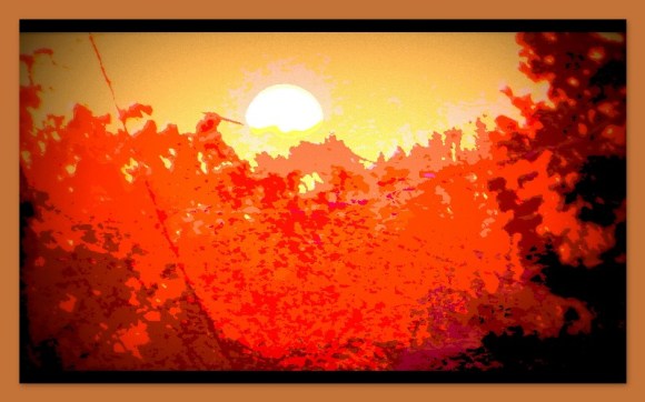 In trying to capture Loves orange orb I slipped and fell And slit the cord The sun spilled out So now where do I begin To try and sneak These rays of love back in ©bk November 8, 2012 I was trying to take a picture of the perfect orange orb sunrise this morning. The rays spilled out into the trees and of course I did not have the correct settings or lens for it but this was fun just the same. bk |